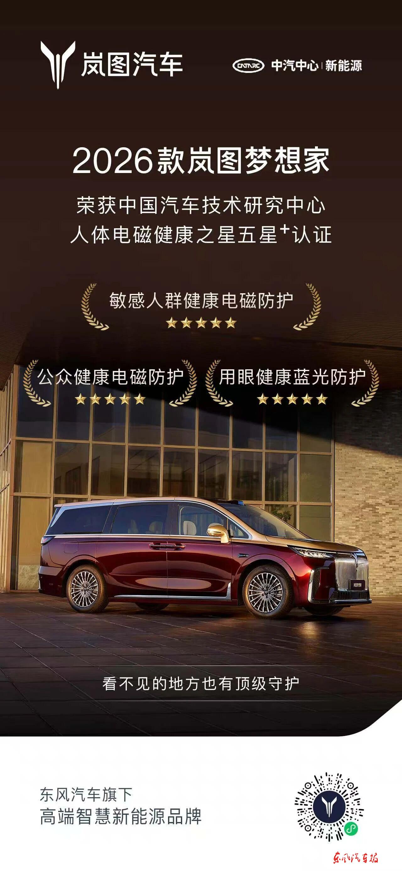 【东风汽车报讯】 近日,2026款岚图梦想家获得中国汽车技术研究中心(中汽中心)颁发的“人体电磁健康之星”证书,以最高等级的“5星+”成绩,成为业内少数获此殊荣的车型之一,让消费者的每一次出行更安心。