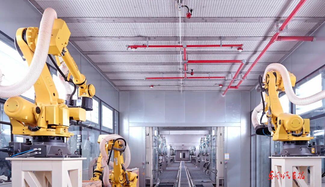 涂装车间是一个高度洁净的自动化“操作间”。52台智能机器人承担从擦净车身到内外喷漆的所有关键工作,实现了喷涂100%自动化。