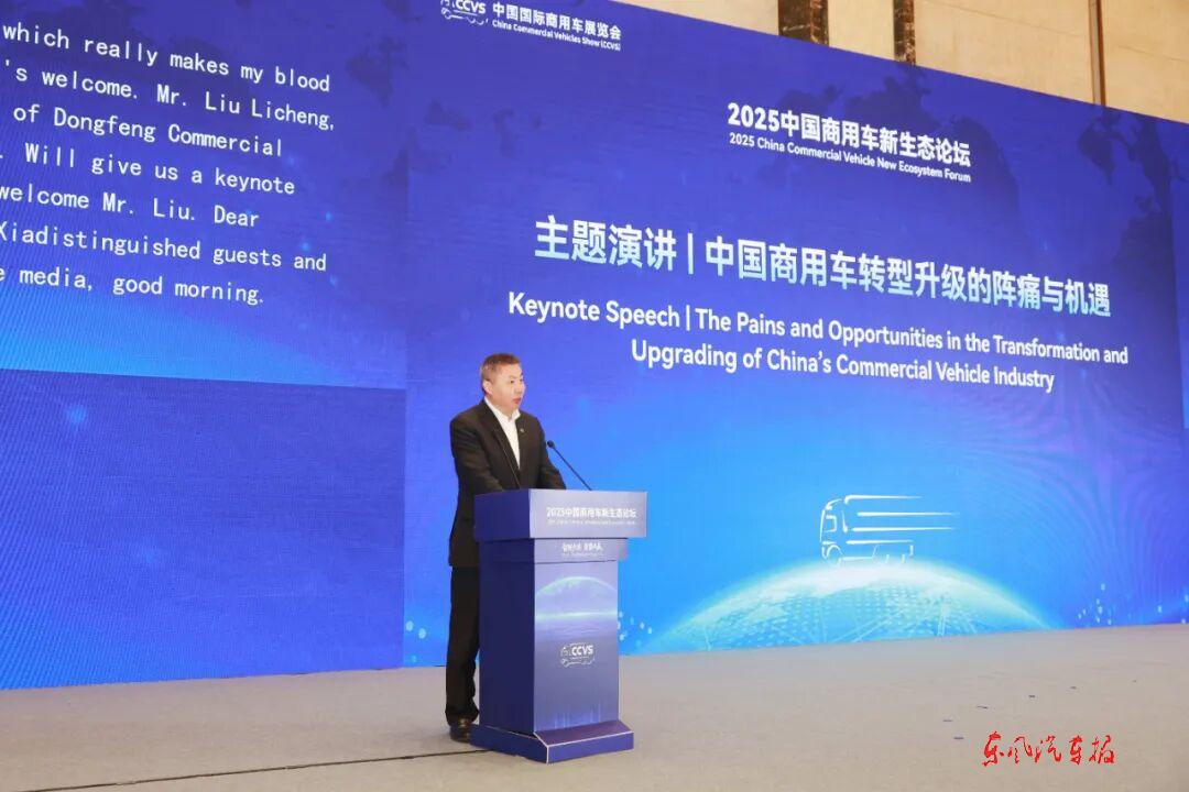 在11月11日“智链全球 聚势共赢”2025中国商用车新生态论坛上,东风商用车总经理刘利成以《拥抱变化 创新转型 合作共赢》为题作主题演讲。