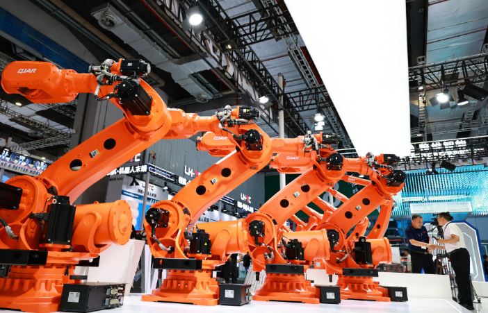 这是2025年9月23日在上海举行的第25届中国国际工业博览会上拍摄的一组大型工业机器人产品。新华社记者 方喆 摄