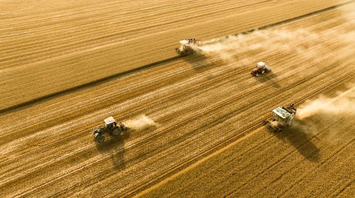 2025年6月4日,在河南省商丘市梁园区李庄镇潘堂村志诚种植农民专业合作社,农机手操作机械在农田作业(无人机照片)。新华社发(李恒 摄)