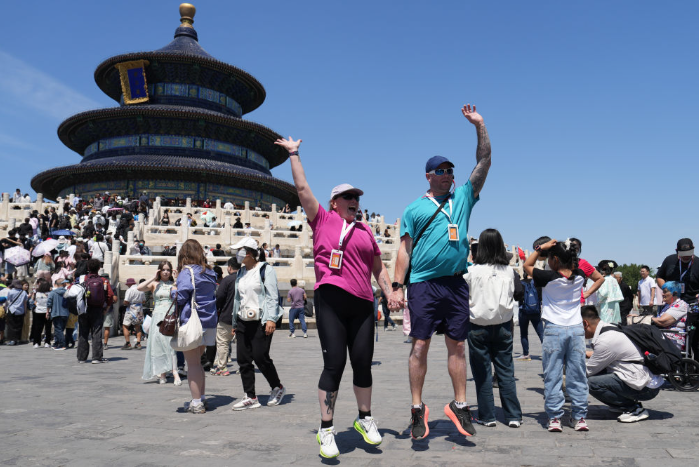 2025年5月1日,来自澳大利亚的游客在北京天坛公园祈年殿前留影。新华社记者 鞠焕宗 摄