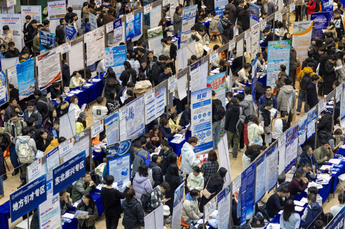 2025年3月26日,在哈尔滨工业大学一校区体育馆内,学生在查看招聘岗位信息。新华社记者 张涛 摄