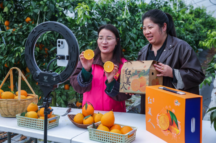 2025年12月4日,在浙江省长兴县和平镇东山村四季鲜果家庭农场,当地青年志愿者为农户直播带货,销售红美人柑橘。新华社记者 徐昱 摄