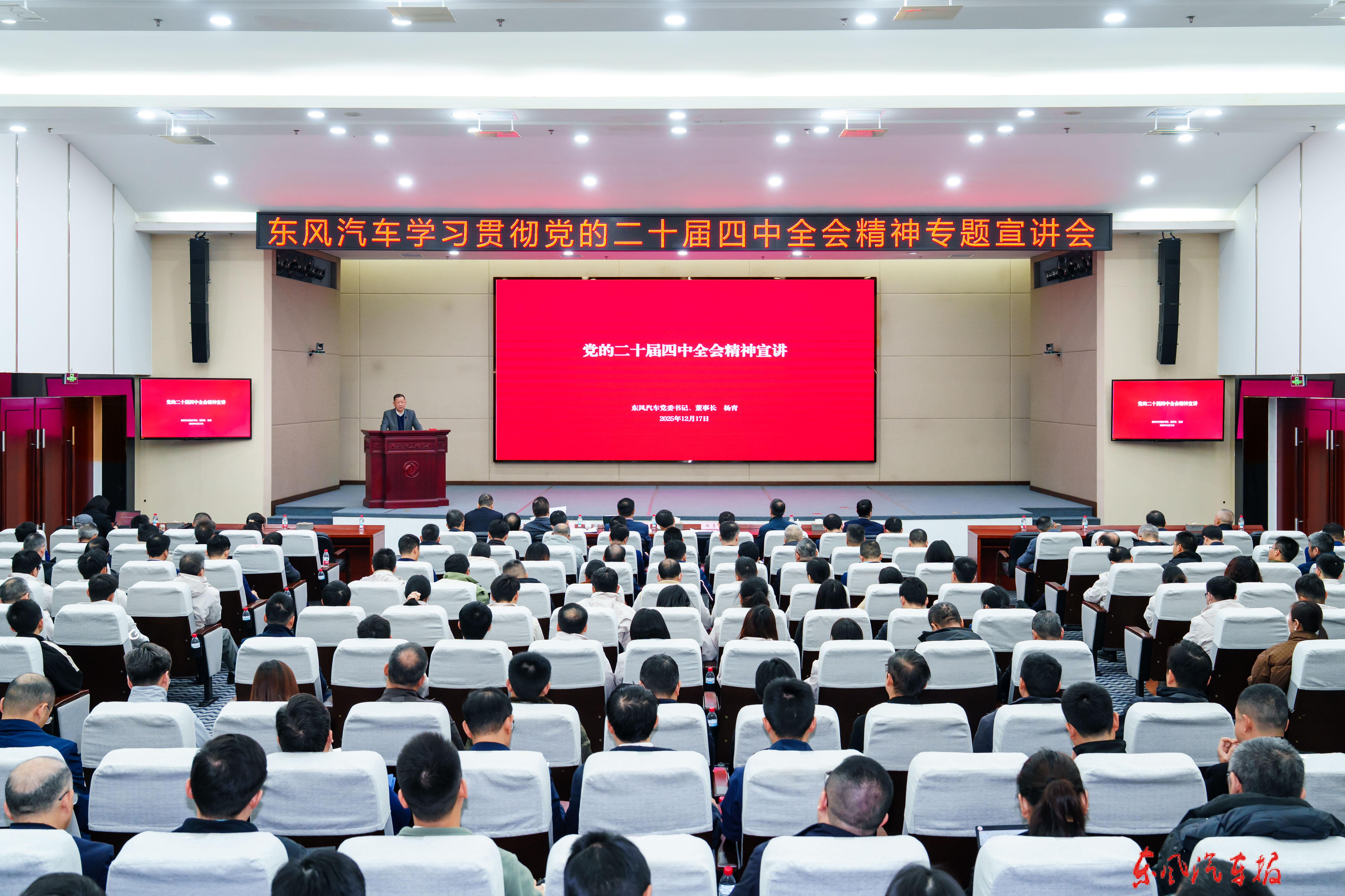 【东风汽车报武汉讯】 12月17日,东风汽车学习贯彻党的二十届四中全会精神专题宣讲会召开。东风汽车党委书记、董事长杨青宣讲党的二十届四中全会精神。他强调,要切实提高政治站位,充分认识党的二十届四中全会的重大意义,自觉把思想和行动统一到全会精神上来,把智慧和力量凝聚到落实全会确定的各项任务上来,以实际行动践行央企“国家队”的使命担当,为以中国式现代化全面推进强国建设、民族复兴伟业贡献东风力量。