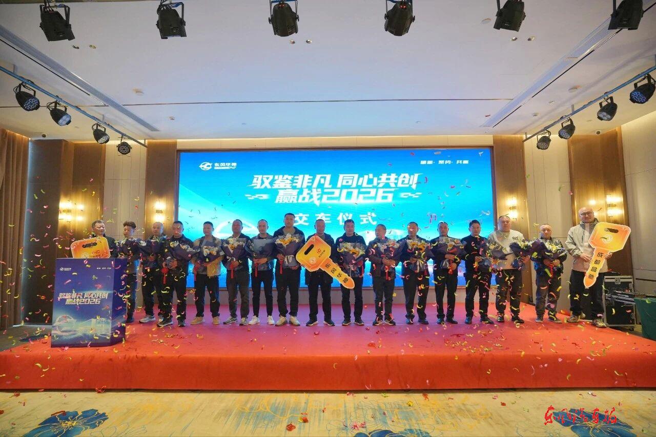 【东风汽车报讯】3月11日,“丝路新程,华神耀疆”新疆和田百台东风华神HS7首批交付仪式在十堰举行。东风特商董事长、党委书记金谋志,东风特商董事、副总经理(主持日常经营工作)陈先兵为20位客户代表颁发象征财富与合作的金钥匙。此次交付的HS7车型,针对新疆长距离、复杂地貌的运输场景量身打造,具备高出勤率、低油耗的硬核产品力。