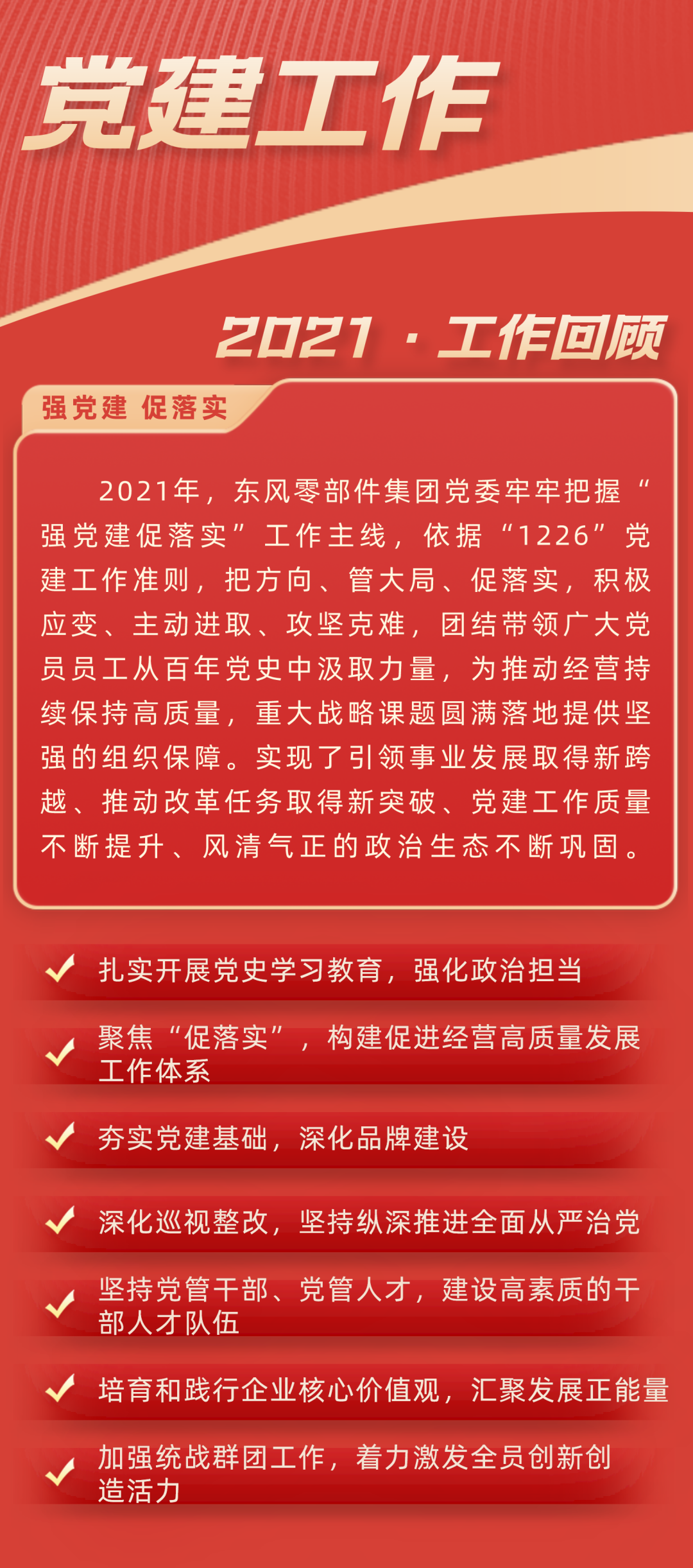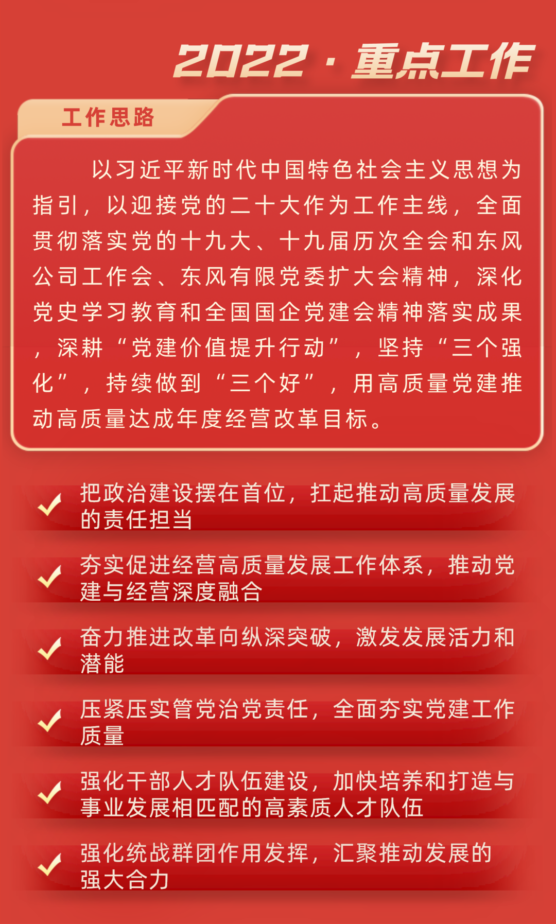 蔡士龙说,2022年是党的二十大召开之年,是东风零部件集团“资产证券化”推进的关键一年。东风零部件集团提出了2022年营业收入必达180亿元及重要改革课题落地等极具挑战的目标,为此,各级党组织和广大党员要以等不起的紧迫感、慢不得的危机感、坐不住的责任感,坚决扛起抓党建促落实的责任,争当“勇打胜利仗”的排头兵。