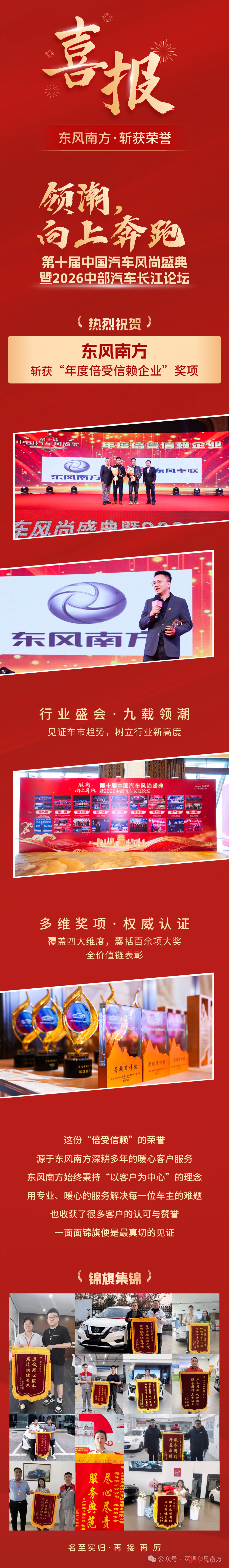 【东风汽车报广州讯】 近日,第十届中国汽车风尚盛典在武汉落幕,深圳市东风南方实业集团有限公司(以下简称“东风南方”)凭借在汽车服务领域的扎实积淀与创新实践,获评“年度备受信赖企业”。该奖项经行业调研、市场反馈及专业评审多维考核选出,是对其品牌公信力与服务价值的权威认可。