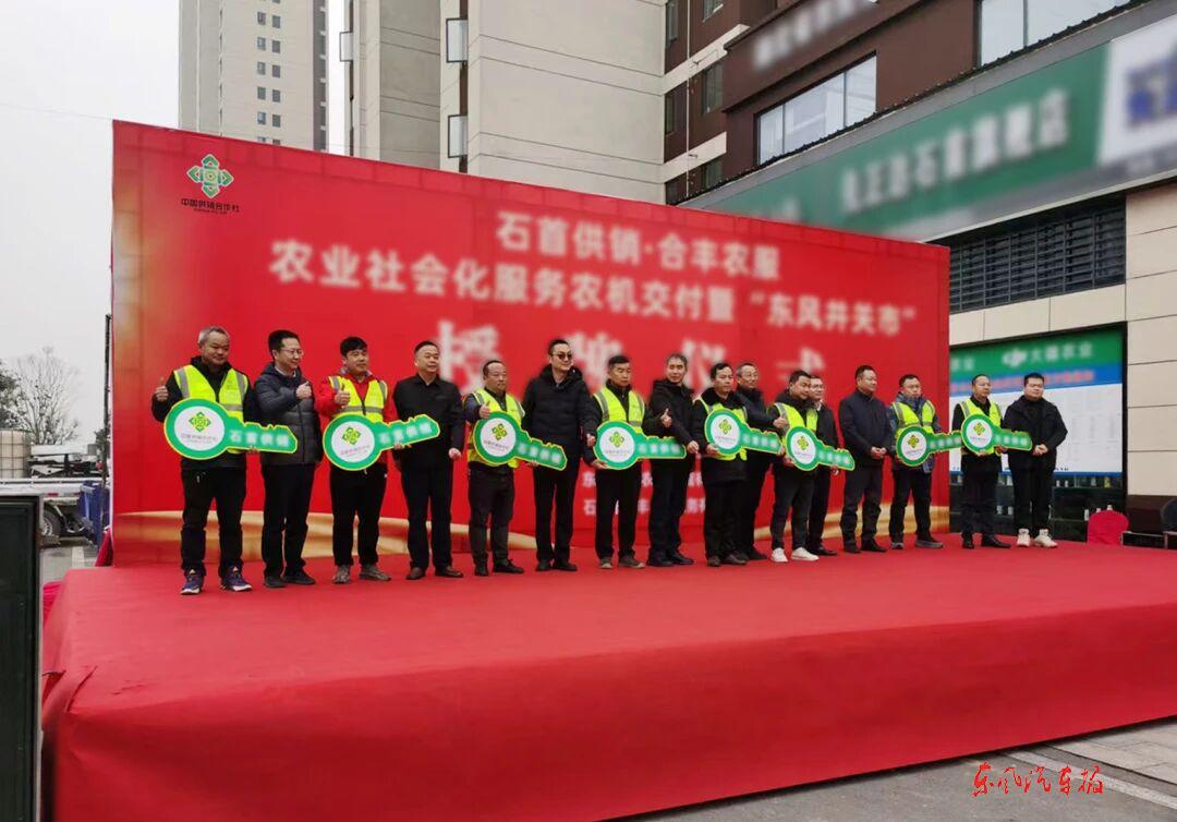 【东风汽车报石首讯】 1月27日上午,石首供销・合丰农服农业社会化服务农机交付暨“东风井关市”授牌仪式在石首市举行。东风井关与湖北省供销合作总社、省供销农服集团、荆州市供销社、石首市供销社等相关负责人一道,为首批8名用户代表交付农机钥匙。此次农机交付暨“东风井关市”授牌,是东风井关深化与湖北省供销社战略合作,布局县域农业社会化服务的重要里程碑,更是东风井关以技术与装备赋能石首农业向机械化、智能化、品牌化迈进的关键举措。