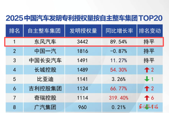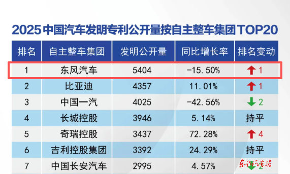 【东风汽车报武汉讯】 近日,中汽信科发布《2025年中国汽车专利数据统计研究报告》。报告显示,2025年东风汽车发明专利授权量达3442件,连续四年位居自主整车集团首位;发明专利公开量5404件,位列自主整车集团第一。
