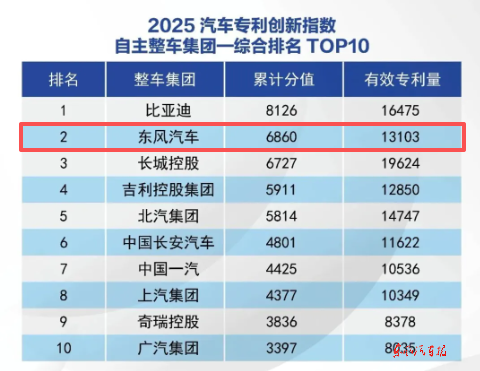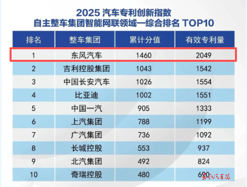 此前发布的“2025汽车专利创新指数”显示,2025年,东风汽车有效专利量13103件,专利创新指数位居自主整车集团第二。其中,东风汽车在智能网联领域拥有有效专利2049件,位列该领域专利创新指数自主整车集团第一,展现出东风在智能网联赛道的深厚技术积累与领先优势。
