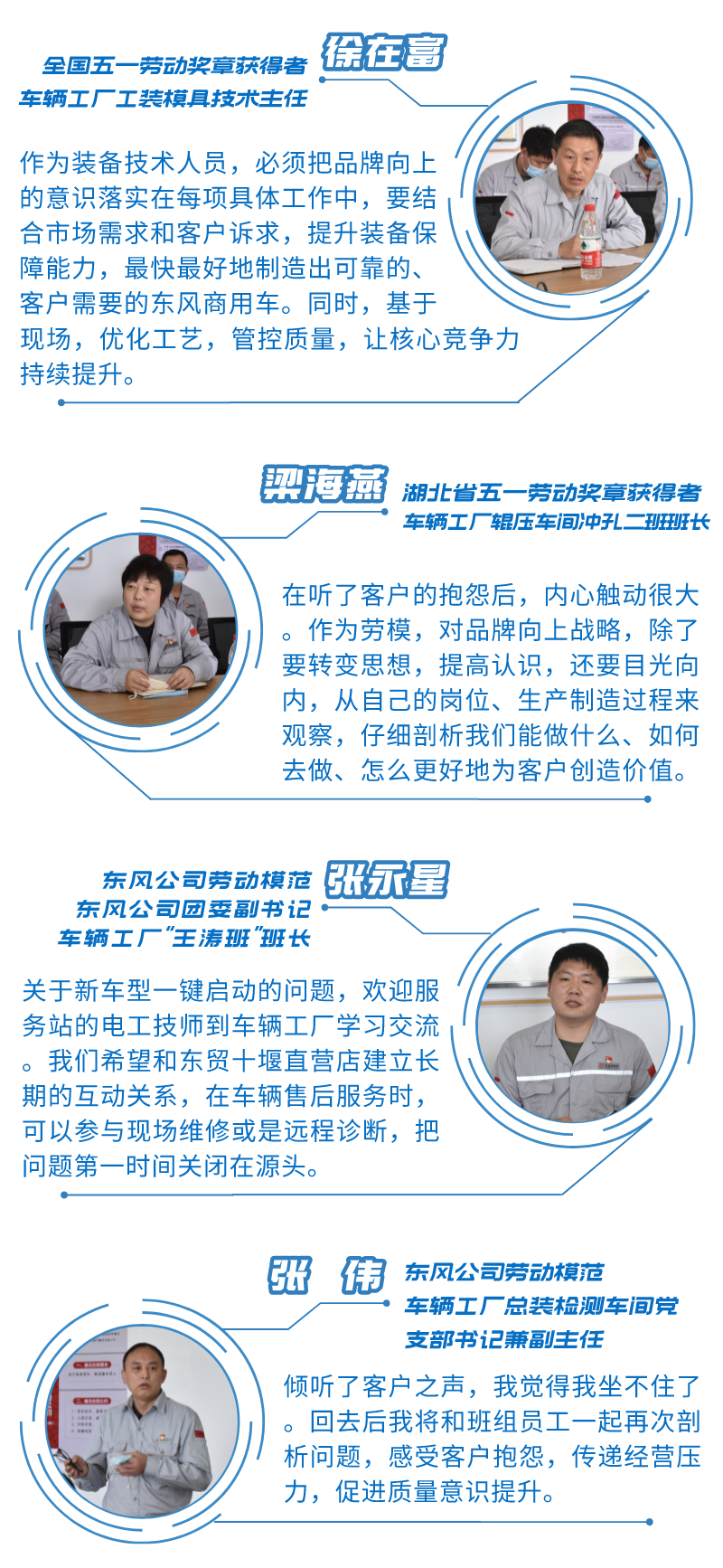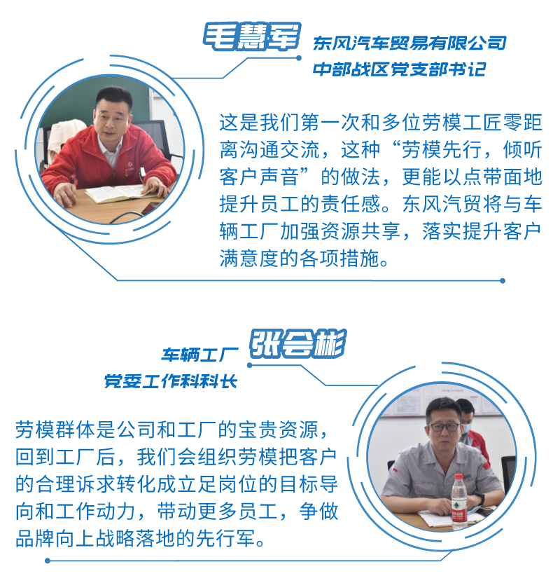 4月26日,来自东风商用车车辆工厂的13位劳模,走进东风汽贸十堰直营店,与营销、售后服务将士面对面交流,倾听客户声音。